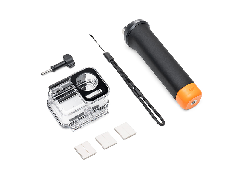 This kit includes the Osmo Action 60m Waterproof Case, DJI Floating Handle, Osmo Locking Screw, and Anti-Fog Inserts.